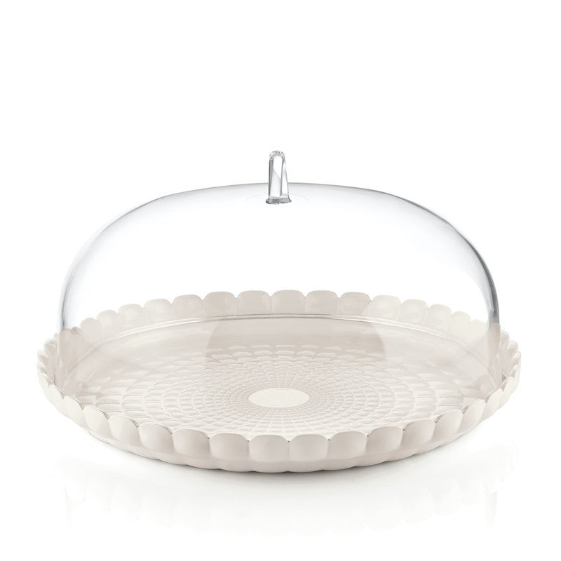 caratterizzata da una campana dalla superficie liscia e dal piatto realizzato con la distintiva lavorazione a quadretti in rilievo di Tiffany. Il piatto double face permette di contenere torte morbide sul lato con il bordo rialzato e torte secche o crostate su lato piano.