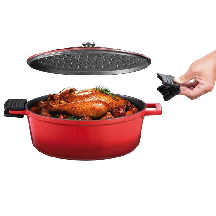 - La forma del coperchio è studiata per far sì che l’acqua che evapora si riversi nuovamente nelle pietanze in cottura;