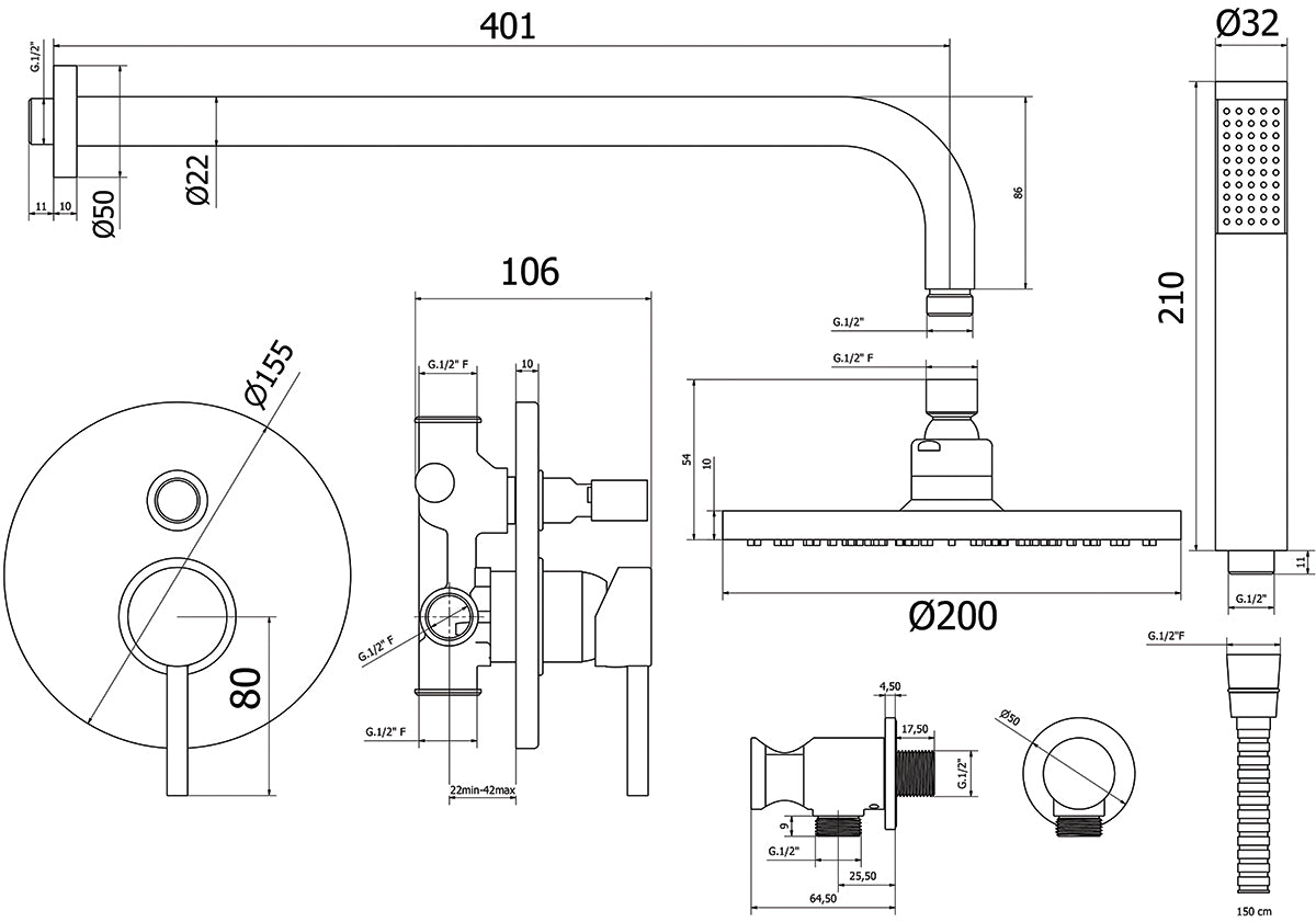 Kit doccia per incasso completo di: miscelatore incasso doccia due vie. Braccio doccia ottone cm.40. Soffione ABS D.20 cm con ugelli anticalcare. Presa acqua in ottone con supporto doccia. Doccia monogetto ABS con ugelli anticalcare. Flessibile PVC cm.150.