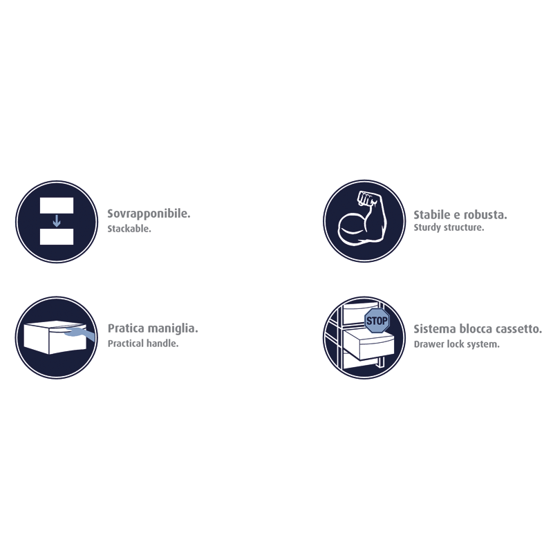 Inoltre, la cassettiera è dotata di una pratica maniglia che facilita la presa e lo spostamento del mobile. Grazie al sistema Stop per i cassetti, inoltre, questi si chiudono in modo morbido e silenzioso, evitando fastidiosi rumori e possibili danni al mobile.