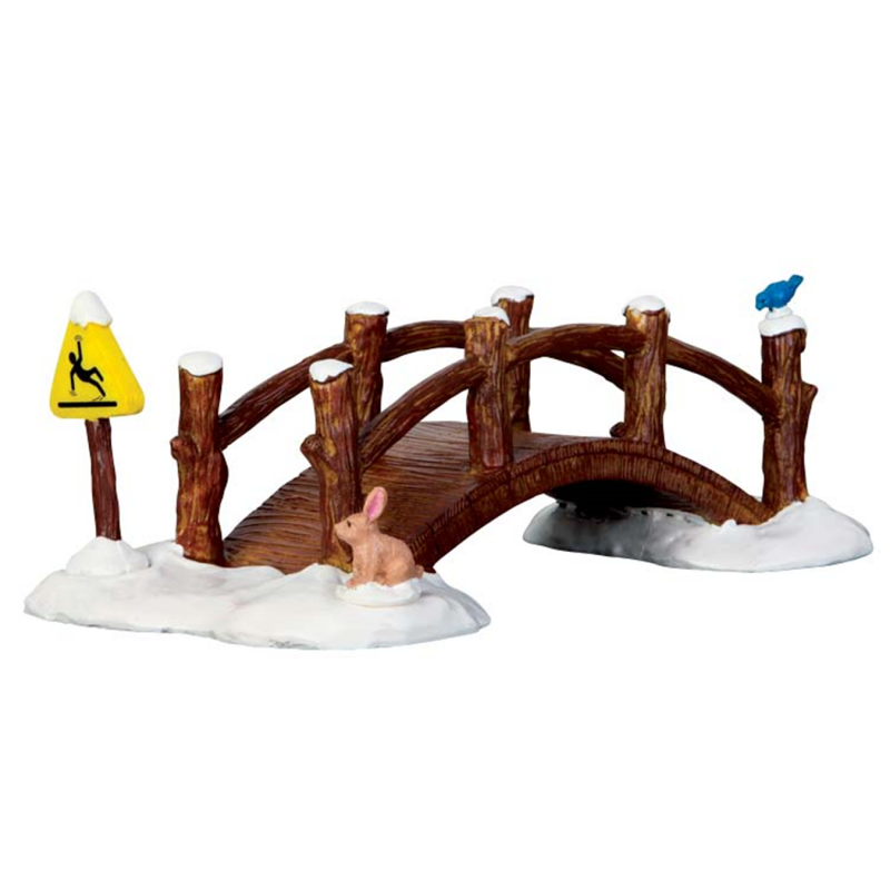 Lemax brug voor over een schaatsvijver of riviertje.