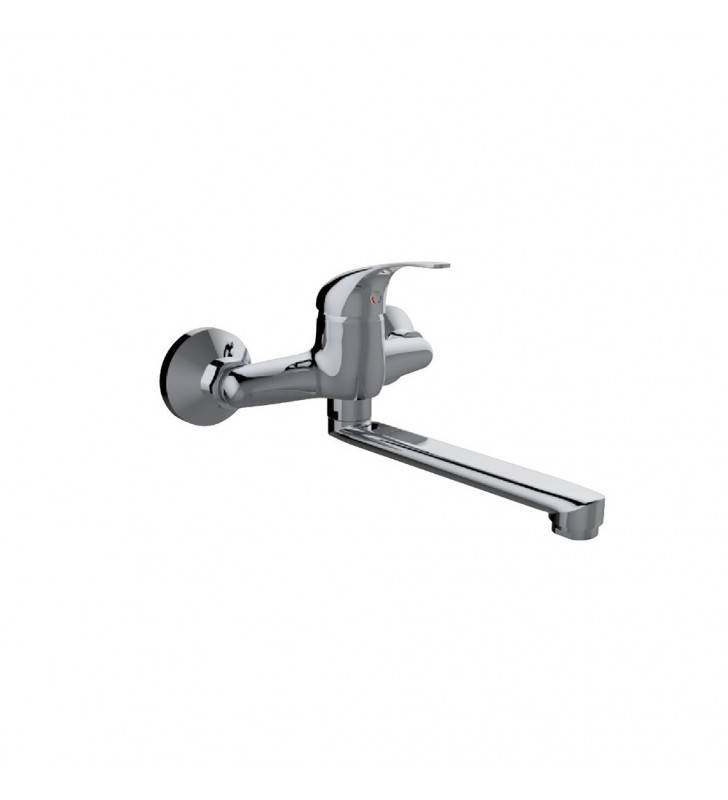 Miscelatore per lavello con installazione a parete e bocca direzionabile. Realizzato in ottone con finitura cromata, questo miscelatore presenta una leva monocomando in metallo e una cartuccia a dischi ceramici con diametro da 35 mm.
