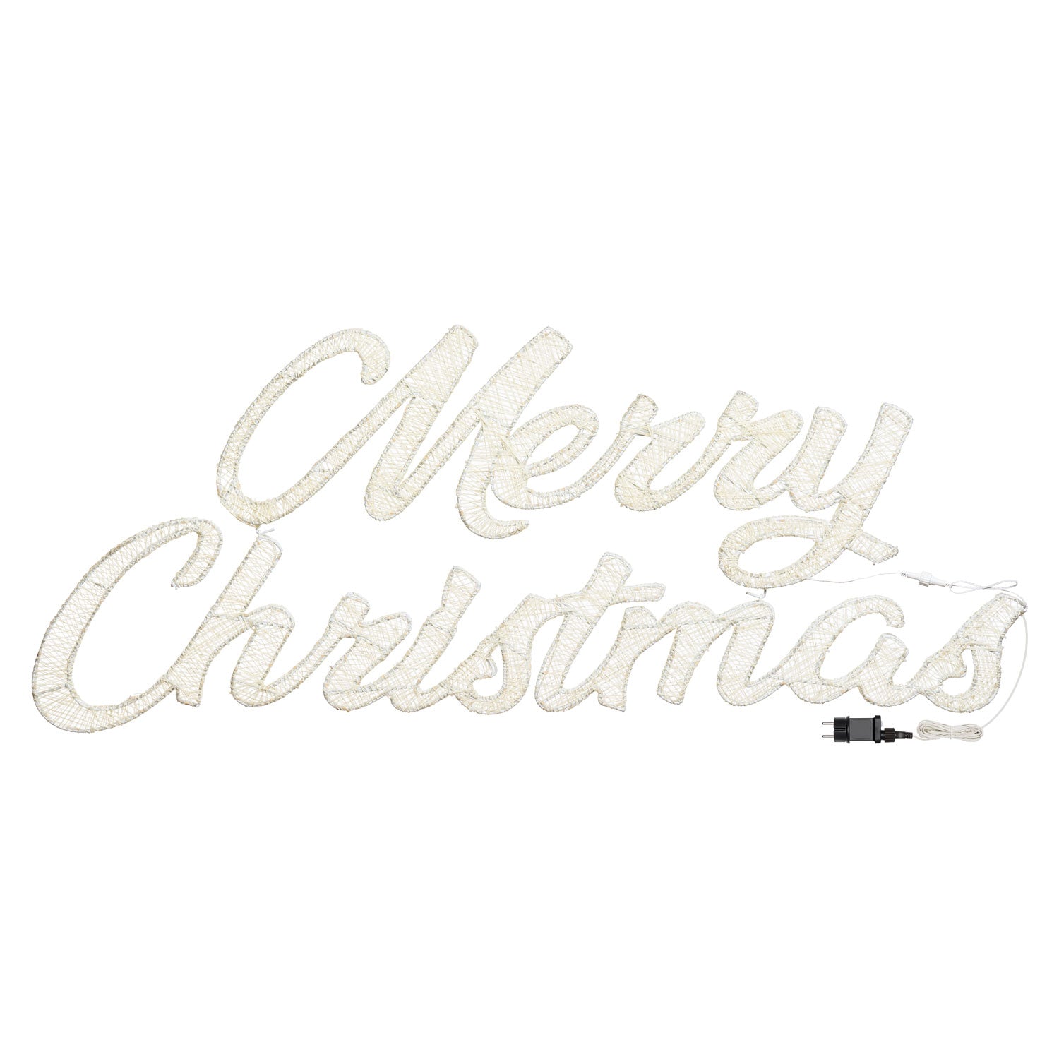 MERRY CHRISTMAS 3D 145xH45cm, Serie LHC 320 Pixel MicroLED TRADITIONAL, Telaio metallo verniciato Bianco, Luce Fissa, LHC Light Cream & Brown, 31V Smart Connect compatibile, Trasformatore SELV di Sicurezza con Timer 8 ore On (16 ore Off) disinseribile tramite Pulsante Luminoso, IP44 uso Esterno e Interno, Cavo Alimentazione Bianco 4m, Dimensioni 145x3xH45cm, Scatola bianca con Etichetta color (XKC Art. LHC MC145-P320-F).