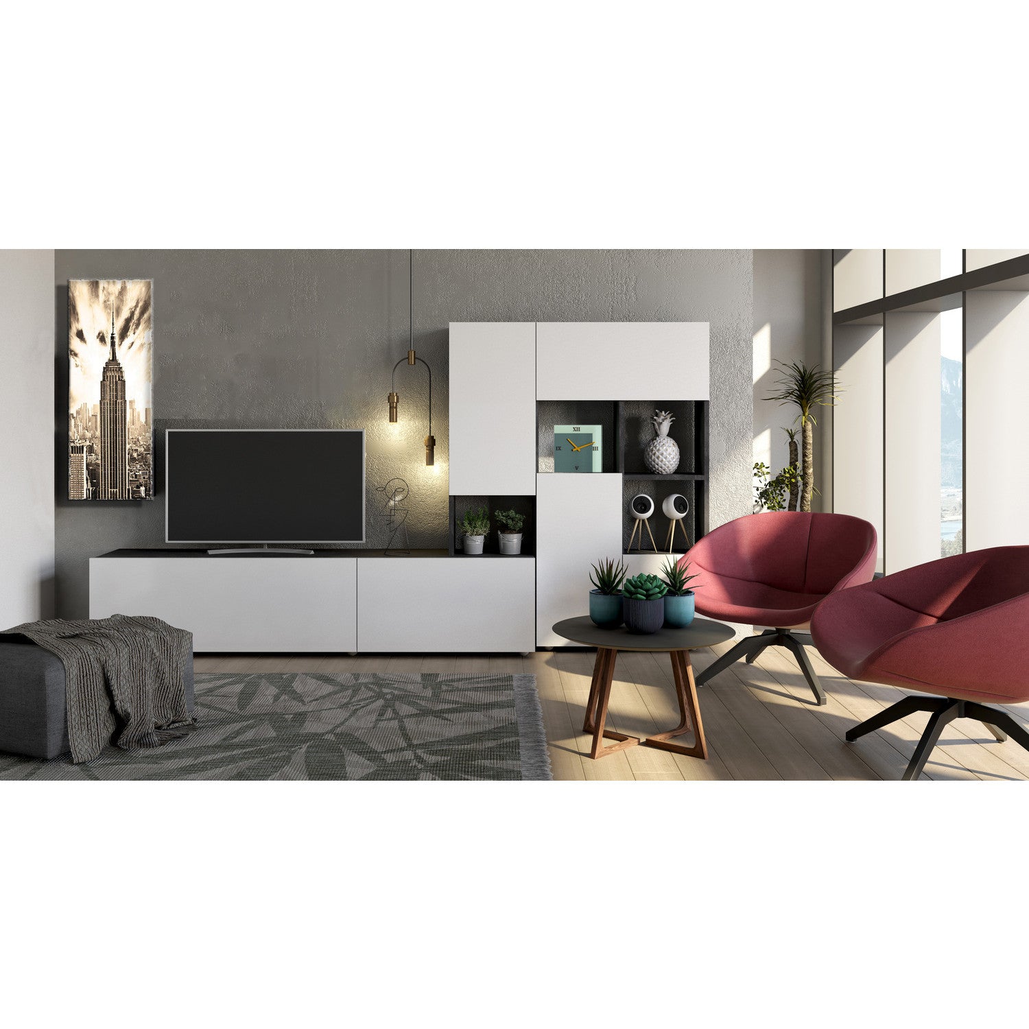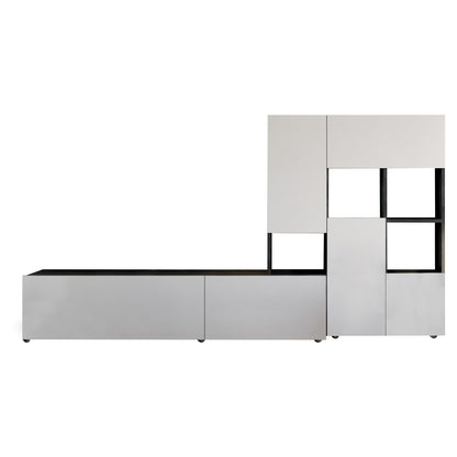 Questa parete attrezzata modulare presenta un design moderno ed elegante ed è caratterizzata da una finitura di colore bianco laccato e grigio Tadao. Struttura portante realizzata con Pannello Ecologico® nobilitato da 22 mm di spessore con rivestimento melaminico Grigio Tadao. Ante in pannello ecologico da 16 mm con rivestimento melaminico Bianco laccato.