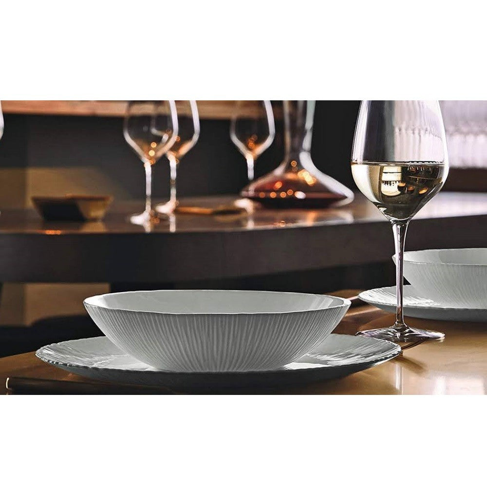 Set da tavola di piatti realizzati in vetro opale temperato, 18 pezzi composti da 6 piatti piani, 6 fondi e 6 frutta.