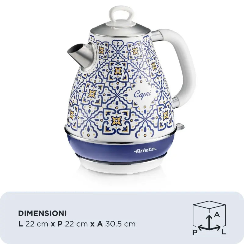 Porta nella tua cucina il fascino del Mediterraneo con il bollitore elettrico, un perfetto equilibrio tra design raffinato e funzionalità all’avanguardia. Ispirato allo stile unico e vibrante della splendida località di Capri, questo bollitore trasforma ogni momento della giornata in una vera pausa di piacere. Le linee sinuose ed eleganti, che richiamano l’arte e la cultura mediterranea, si uniscono a una capacità di 1,7 litri, ideale per preparare infusi, tè, tisane e bevande calde per tutta la famiglia. La base cordless garantisce massima praticità d’uso, permettendo di sollevare e riposizionare il bollitore con facilità. Dotato di sistema di autospegnimento, assicura sicurezza e comfort durante l’utilizzo quotidiano. Un vero alleato per chi ama concedersi una colazione rilassante o una pausa pomeridiana all’insegna del gusto e dello stile.
