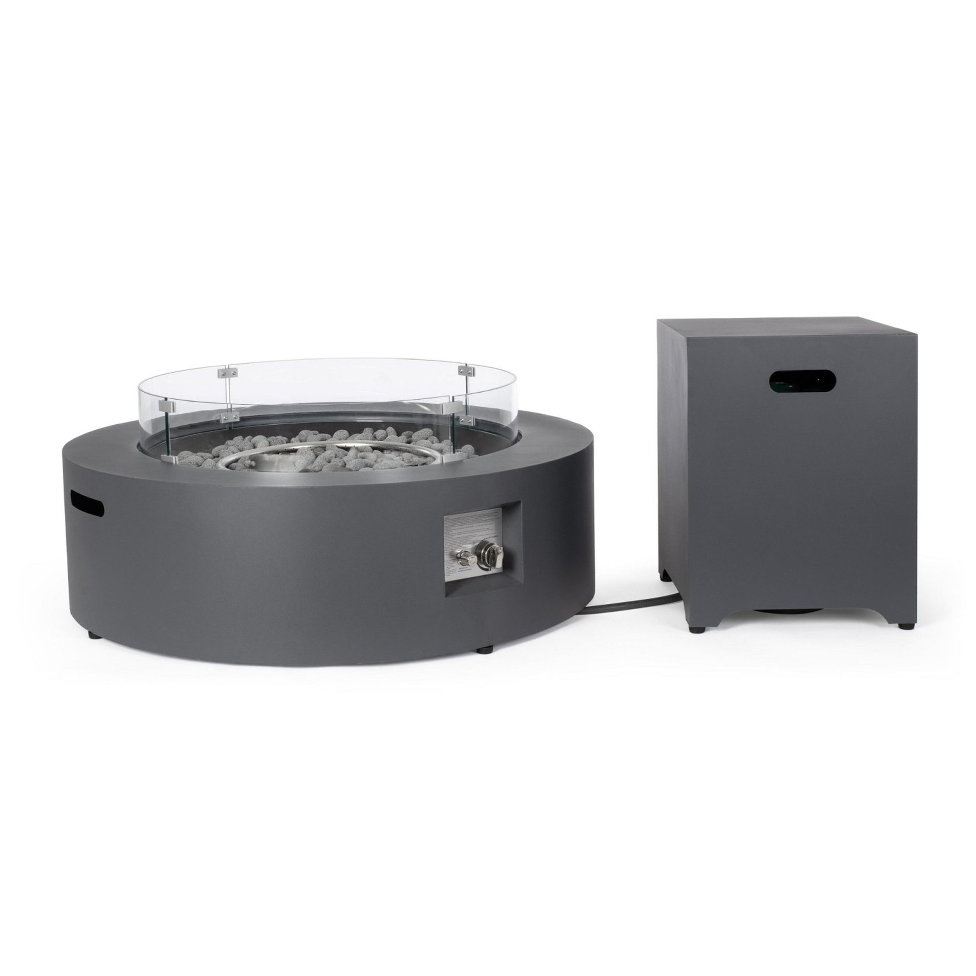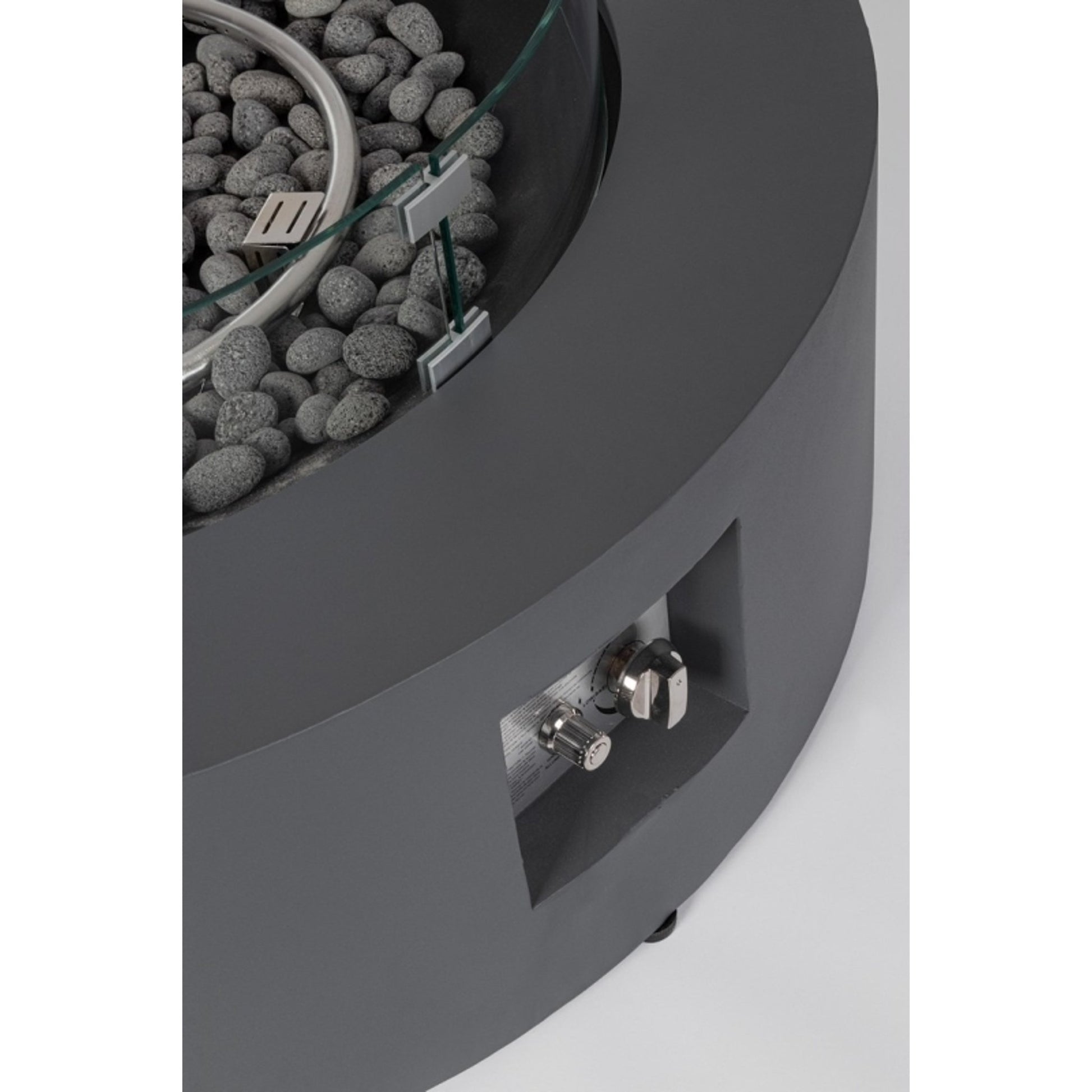 Scopri il camino a gas Ø104 x 30 cm in grigio scuro, dotato di una robusta struttura in acciaio verniciato con uno spessore di 0,8 mm. Questo elegante paravento per camino è realizzato in vetro removibile di 5 mm, mentre le misure del vetro sono Ø74 x 14 cm. Il bruciatore ha un diametro di Ø45 cm ed è fornito di un coperchio in acciaio verniciato per proteggere l'articolo quando non è in uso. Include anche sassi decorativi in roccia lavica di colore grigio scuro e una copertura in telo nero per una maggiore protezione. Con un peso di 42,90 kg, questo camino rappresenta un'aggiunta raffinata e funzionale al tuo spazio esterno.
