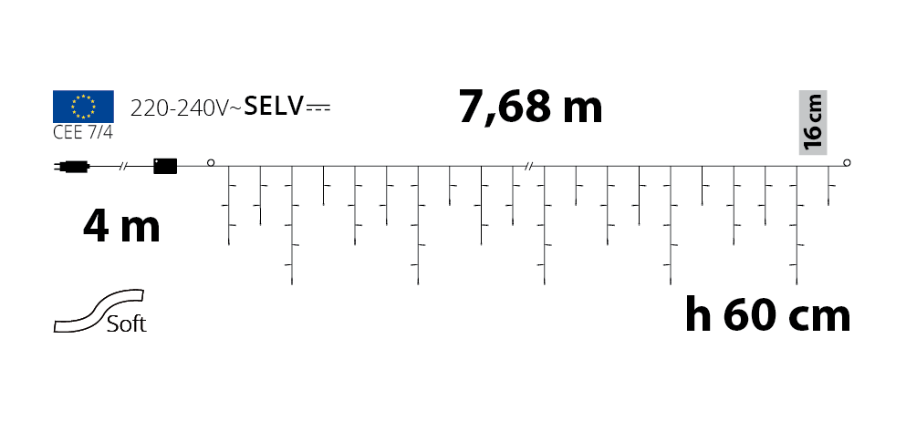 Scopri l'incanto dell'illuminazione esterna con l'Ice Light 180 LED multicolore. Questo sistema di luci è dotato di un controller timer con otto giochi di luce selezionabili, che possono essere facilmente impostati per attivarsi e disattivarsi secondo le tue esigenze, grazie alla funzione timer On-Off programmabile per 8 o 16 ore. Il trasformatore a 24V garantisce un uso sicuro all'esterno, mentre il cavo soft bianco si integra perfettamente nel tuo ambiente. Con dimensioni di 4 metri x 768 cm di larghezza e 60 cm di altezza, questa decorazione luminosa è perfetta per eventi speciali o per dare un tocco di colore al tuo spazio esterno.