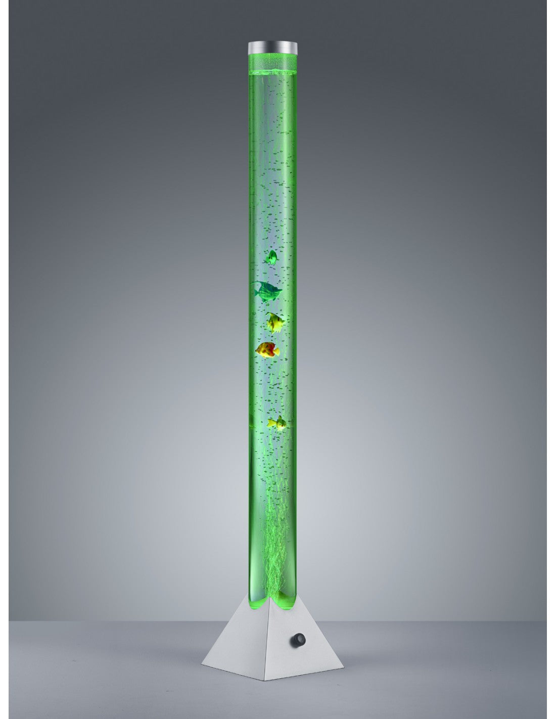 La lampada da terra MOTION di Trio Lighting è composta da una struttura cilindrica in plastica finitura titano e diffusore in plastica trasparente, interruttore a filo incluso. All'interno del diffusore cilindrico pesciolini colorati galleggianti.