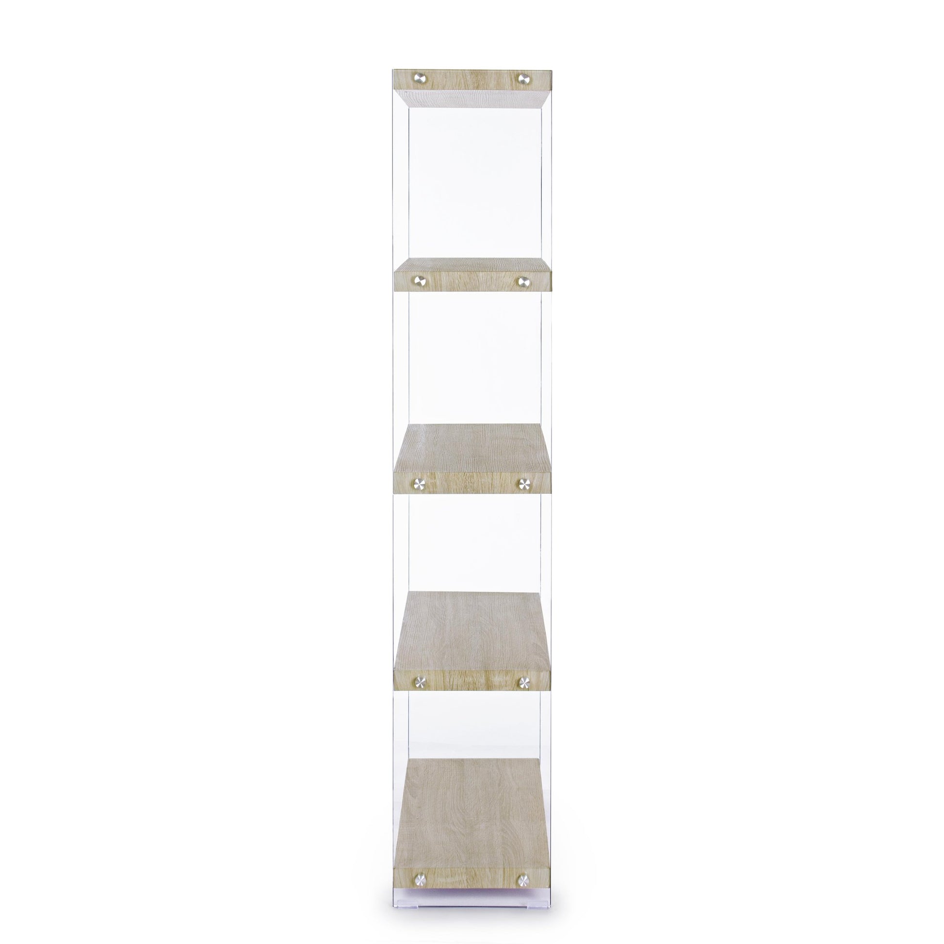La libreria da appoggio Sury è un elemento d'arredo elegante e funzionale, alta 160 cm e larga 75 cm. Realizzata con fianchi in vetro temperato e mensole in mdf con rivestimento protettivo in PVC 3D, simula realisticamente le venature e i colori del legno naturale rovere massello. Questo design minimal permette di inserirla facilmente in diversi contesti di arredamento, sia moderni che classici, riempiendo gli spazi senza appesantirli. Composta da 5 ripiani in legno, può essere posizionata sia a centro stanza che a parete. Facile da montare in pochi minuti, non richiede parti aggiuntive.