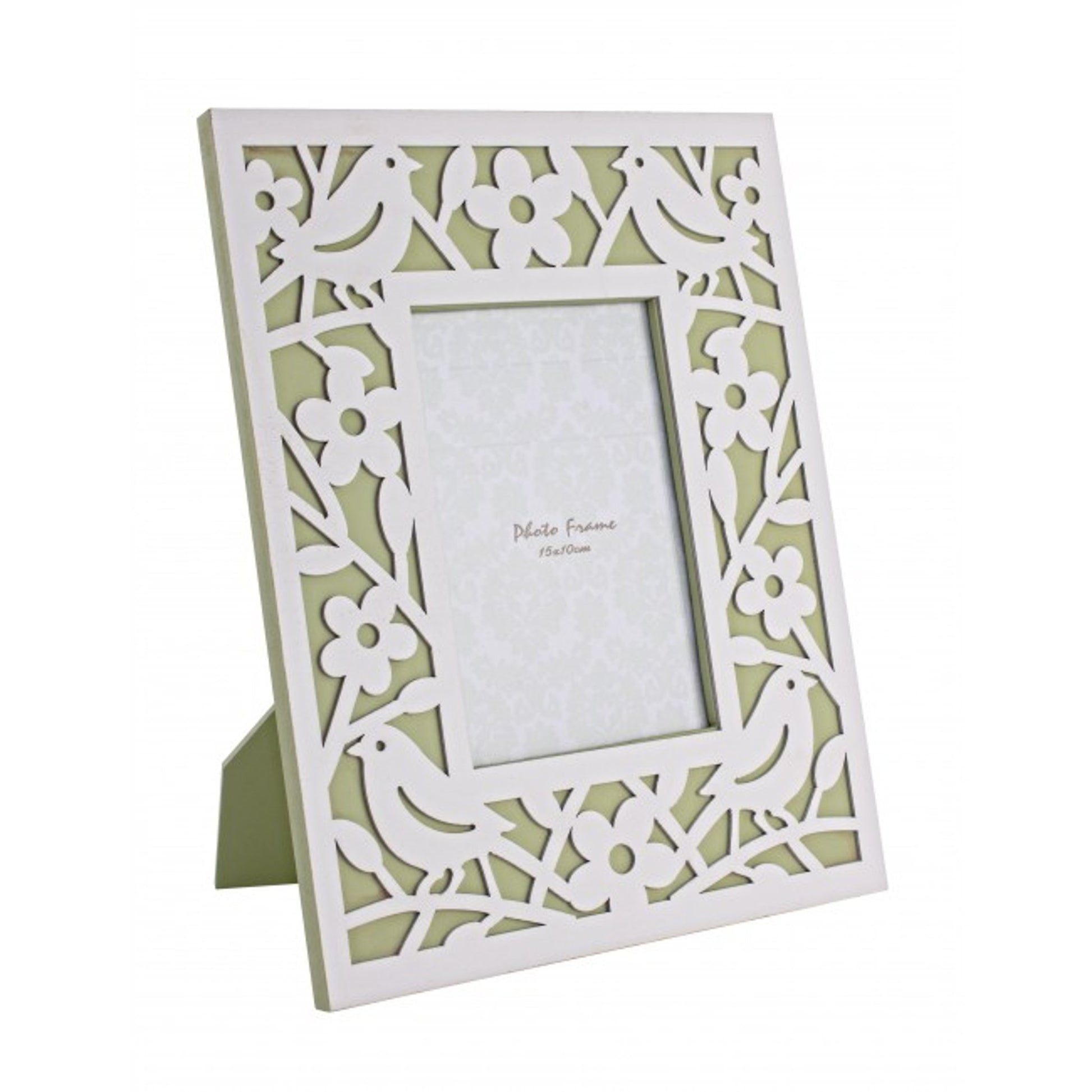 Portafoto rettangolare in colore verde, realizzato in legno. Design elegante con dettagli decorativi ispirati alla natura. Ideale per incorniciare ricordi speciali con un tocco di stile. Dimensioni: 21 × 1,5 × 26,5 cm.