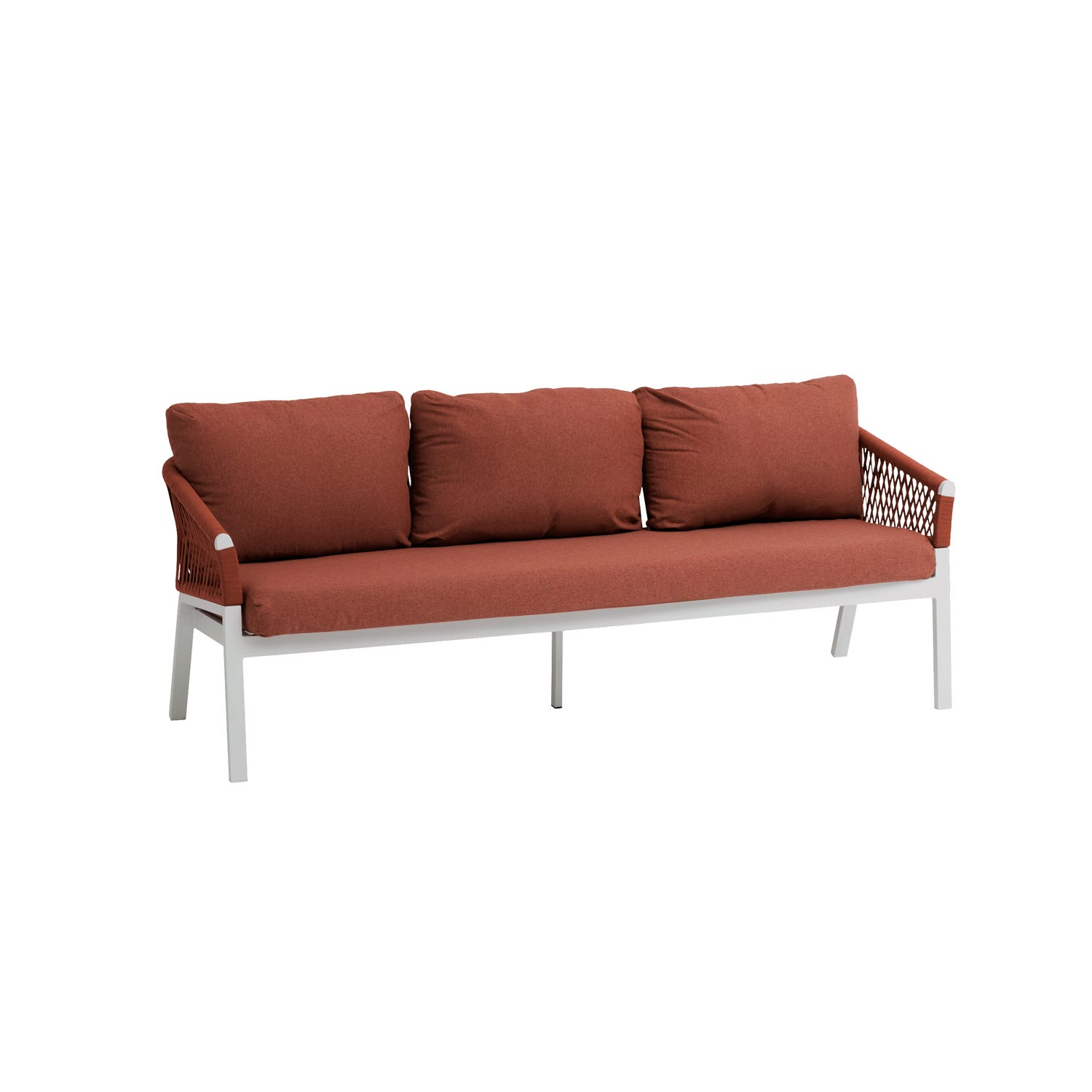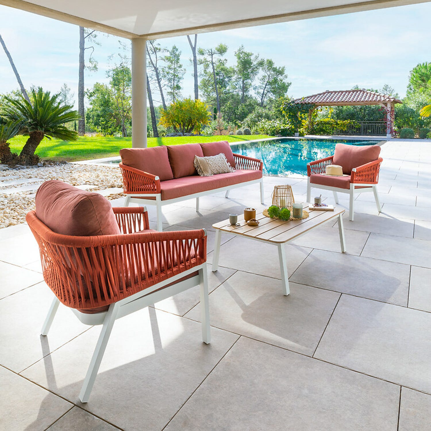 - Include: Divano a 3 posti, due poltrone, tavolino in acacia